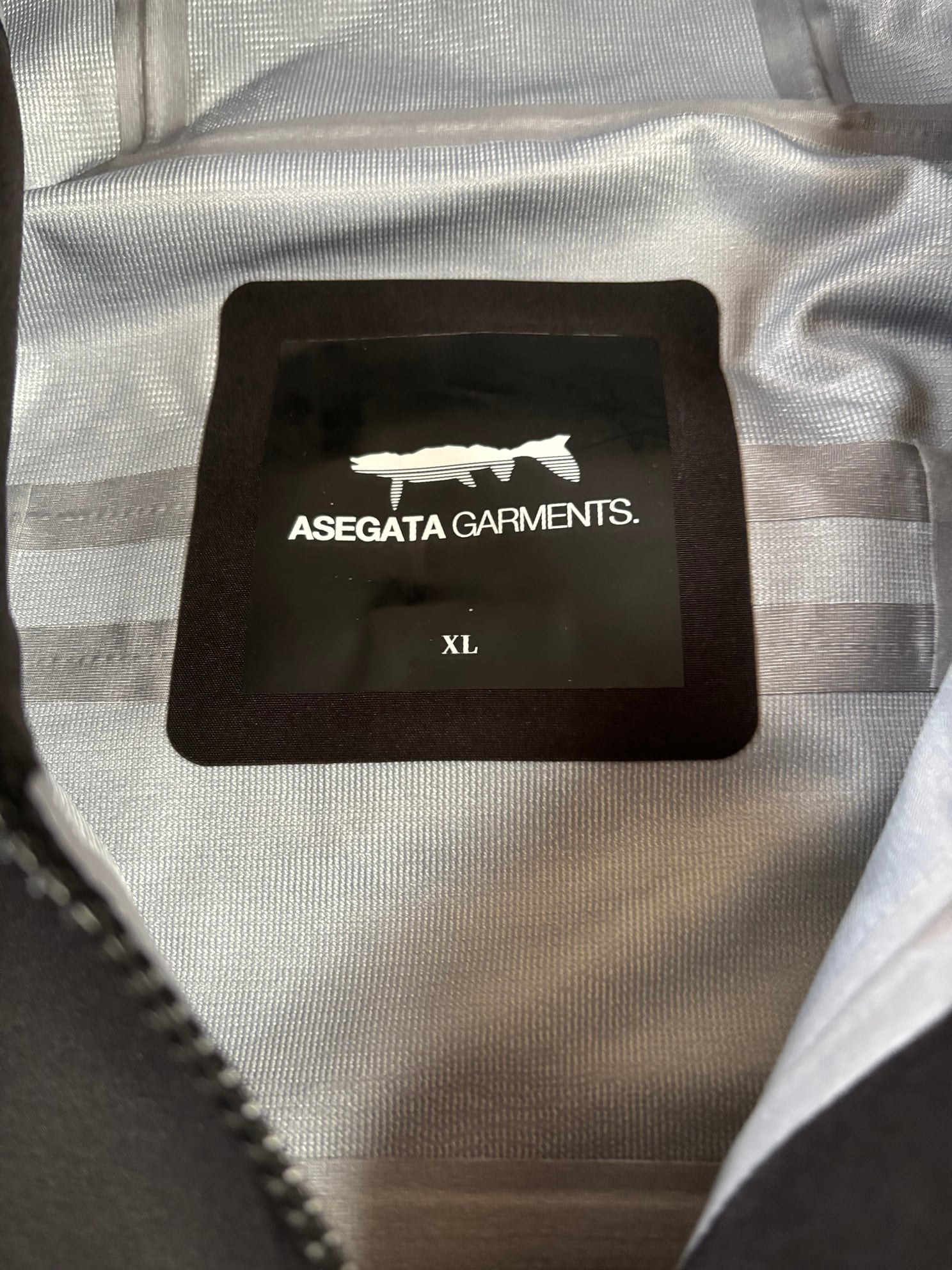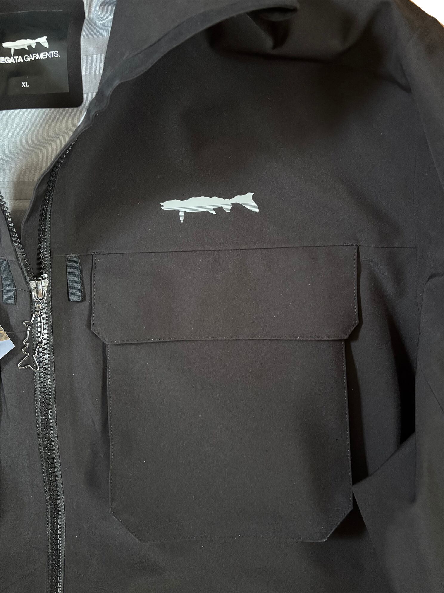 陽の出前の氷点下、極寒の放射冷却、強風、不意の雨。刻々と変わる中禅寺湖の天候に対応するため、ライトダウン、フリース、シャツなどを重ね着しやすいように、チェストからアームにかけてゆったりめに仕上げました。防水性、透湿性を兼ね備えた3レイヤー素材を使用して、悪天候でも安心して使用できるものです。デザインはシンプルかつ機能的に、ルアー・フライケースが丁度よく収納できる胸ポケット。下部のハンドウォームポケットは雨が入らないように折り返し仕様。袖口は水が侵入しないように防水素材を使用しています。左胸にはレイクトラウトマウンテンサイドのマーク。左袖にASEGATA ロゴタイプ。背中にはASEGATA GARMENTSロゴタイプのバッジにDリングを設置。その下には止水ジップを使用したサブポケット。メインジップのスライダーは特徴的なレイクトラウトマークを金属加工で仕上げ所有感を高めます。